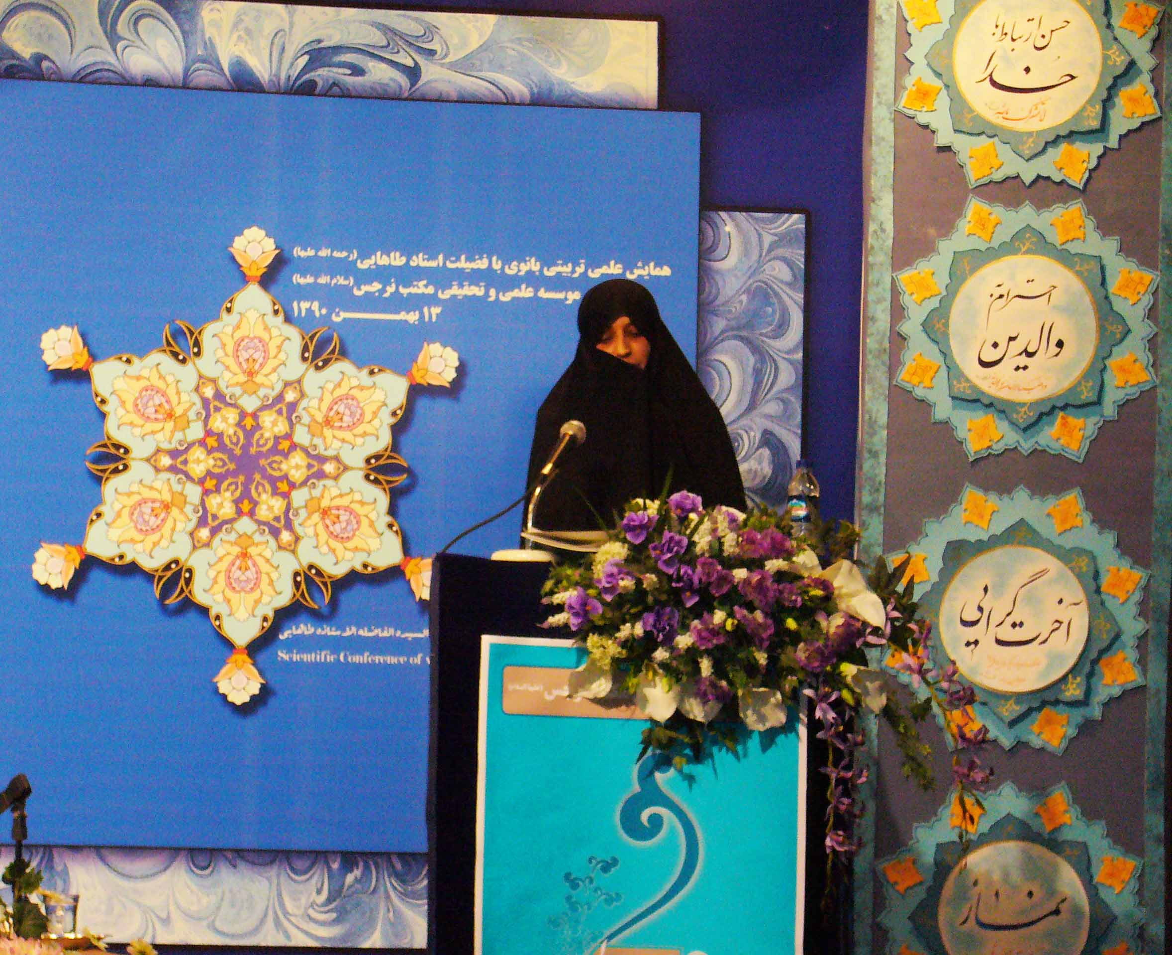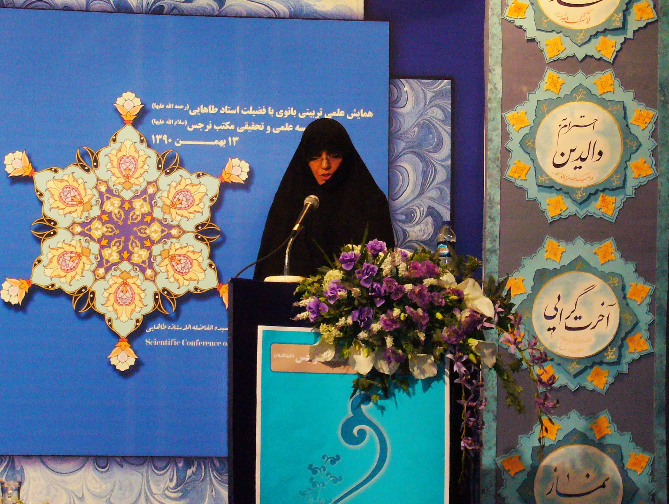 در ادامه برگزاري اين پيش نشست ، سخنران اصلي همايش خانم صفاتي به ايراد سخنراني پيرامون كسب فضائل اخلاقي پرداخته و گفت: رژیم طاغوت به شدت براي كارهاي عادي و بخصوص كارهاي ديني با رشد و تعالی انسان ها (طبقه نسوان) مقابله مي كرد و مي خواست آنان را به انحراف بکشانند. اما تشكيلاتي براي رشد خانم ها برگزار شد و خانم طاهايي (ره) از پيشكسوتان در اين زمينه بودند و در موقعیتی که انجام کارهای معمولی دشوار بود، افرادی را پرورش دادند و موفق شدند خدمات ارزنده ای ارائه دهند. در آن عصر درخشش زنان برجسته کشور که در درجه اول قبل از این مکاتب خانم امین اصفهانی در اصفهان و بعد هم در مشهد به خصوص تشکیلاتی در جهت رشد بانوان برگزار شده بود.